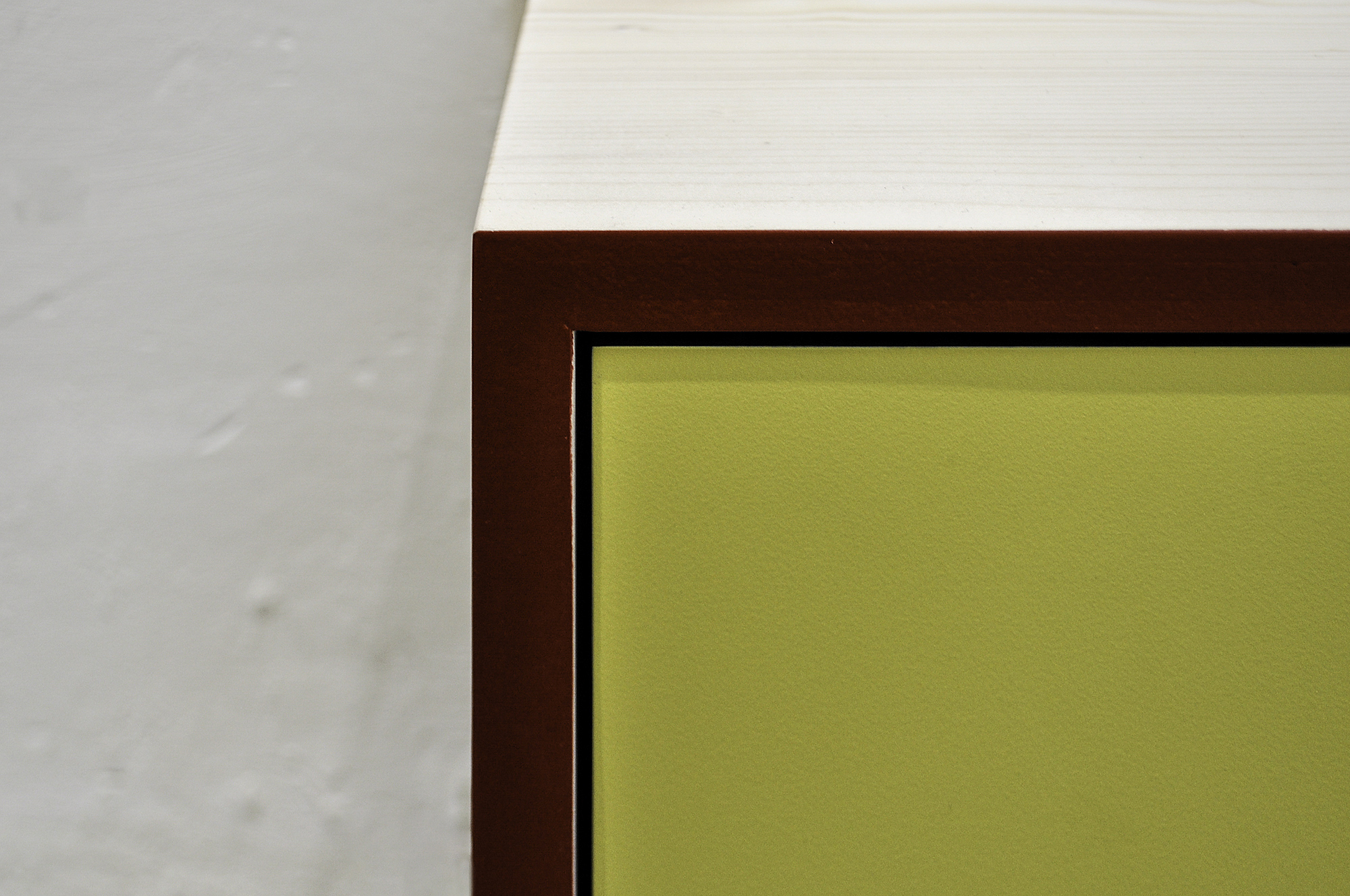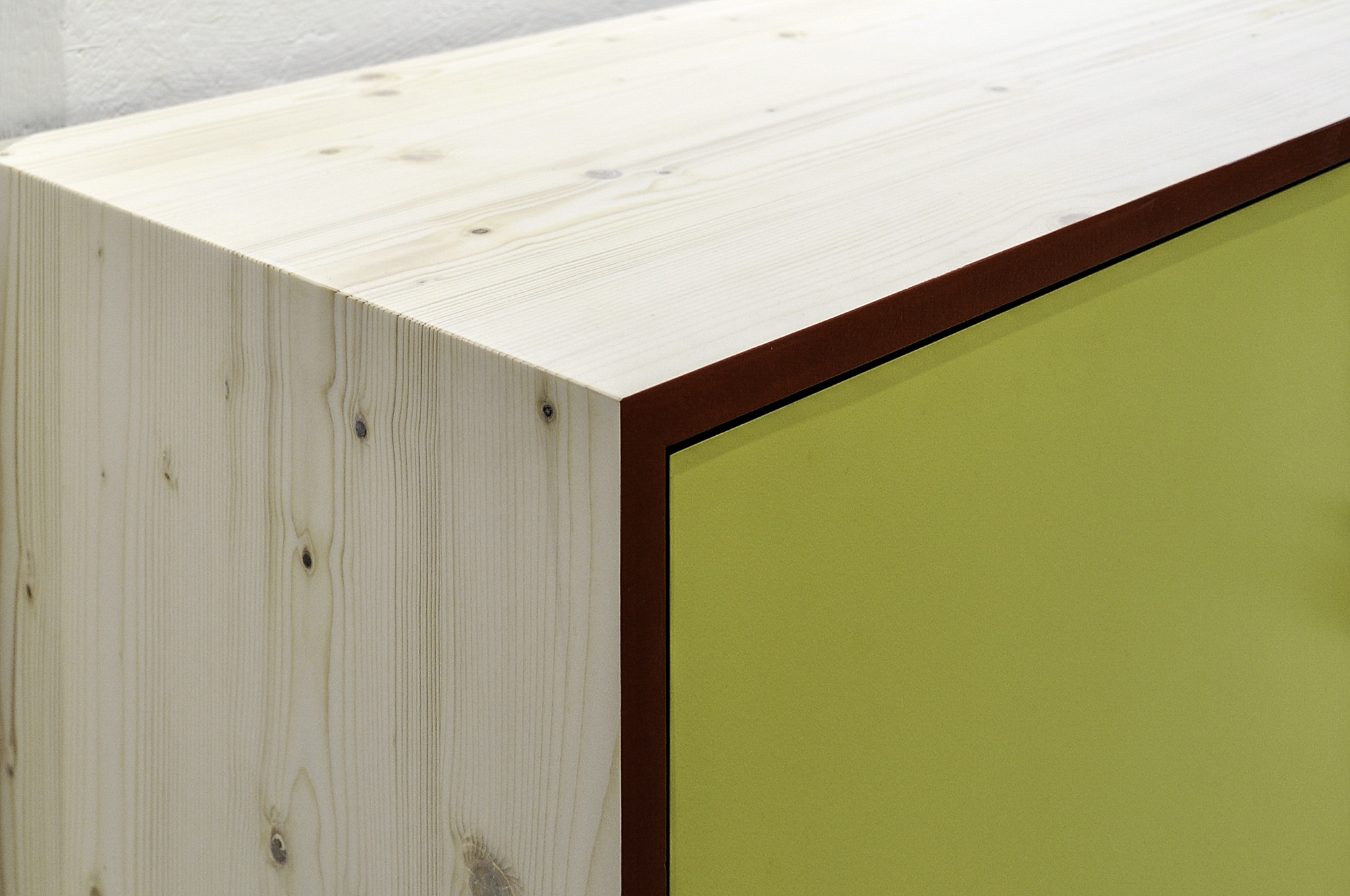 Die Korpen sind mit weiss-pigmentiertem Öl geölt und die Kanten lackiert. Die Fronten sind aus zinkgelbem HPL mit schwarzem Kern.